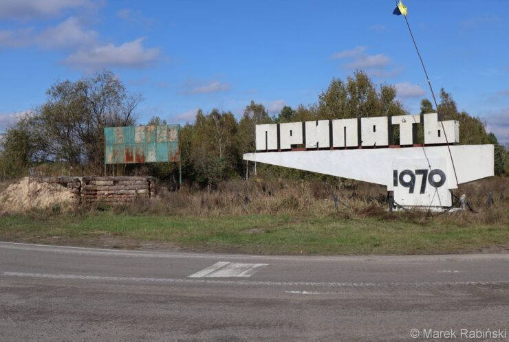 Nowe oblicze steli wjazdowej do Prypeci. Po 55 latach zmieniono zapis miasta z rosyjskiego na ukraiński. Między literami “p” i “ja” pojawił się apostrof.