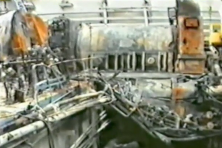 O godz. 20.10 czasu kijowskiego jeden z turbogeneratorów bloku nr 2 zapalił się z powodu uszkodzenia izolacji instalacji kablowej. Pożar, w czasie którego spłonęło ponad 180 ton oleju turbinowego i 500 metrów sześciennych wodoru, zniszczył dach hali turbin, a także uszkodził ważne elementy wyposażenia reaktora.