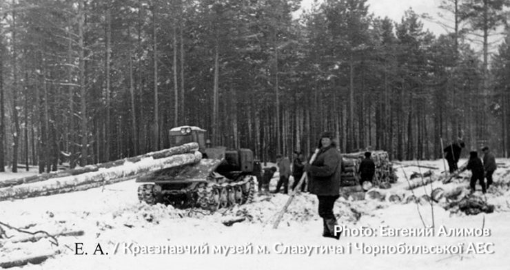 Wtedy drwale z czernihowskiego gospodarstwa leśnego zaczęli wycinkę drzew pod przyszłe miasto czarnobylskich atomistów. Ze względu na braki sprzętowe, w tym specjalistycznych pojazdów do szybkiego wyrębu drzew, posiłkowano się zwykłymi maszynami rolniczymi. Do pracy skierowano m.in. brygadę traktorzystów z kołchozu „Progres” ze wsi Petruszi z obwodu czernihowskiego.
