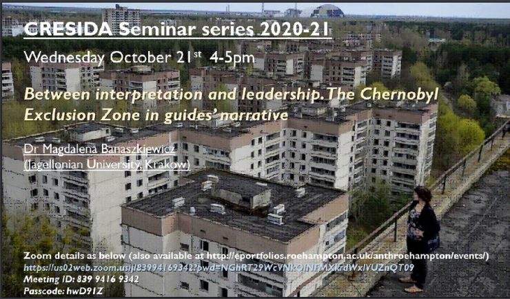 Zapraszamy na wykład dr Magdaleny Banaszkiewicz z Uniwersytetu Jagiellońskiego o problemie interpretacji dziedzictwa Czarnobylskiej Strefy Wykluczenia przez lokalnych przewodników. Wydarzenie odbędzie się w środę, 21 października o godz. 17.00 czasu polskiego (godz. 16.00 czasu brytyjskiego) na platformie ZOOM.