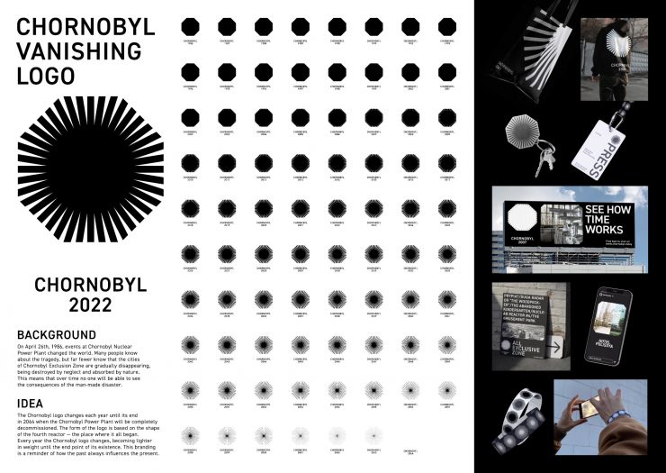 Podstawę grafiki stanowi obramowanie górnej płyty reaktora RBMK. Każdego roku znak ewoluuje – kolor czarny sukcesywnie i równomiernie będzie zastępowany przez kolor biały… aż do 2064 r., czyli planowanej chwili całkowitego wyłączenia z eksploatacji elektrowni jądrowej w Czarnobylu.