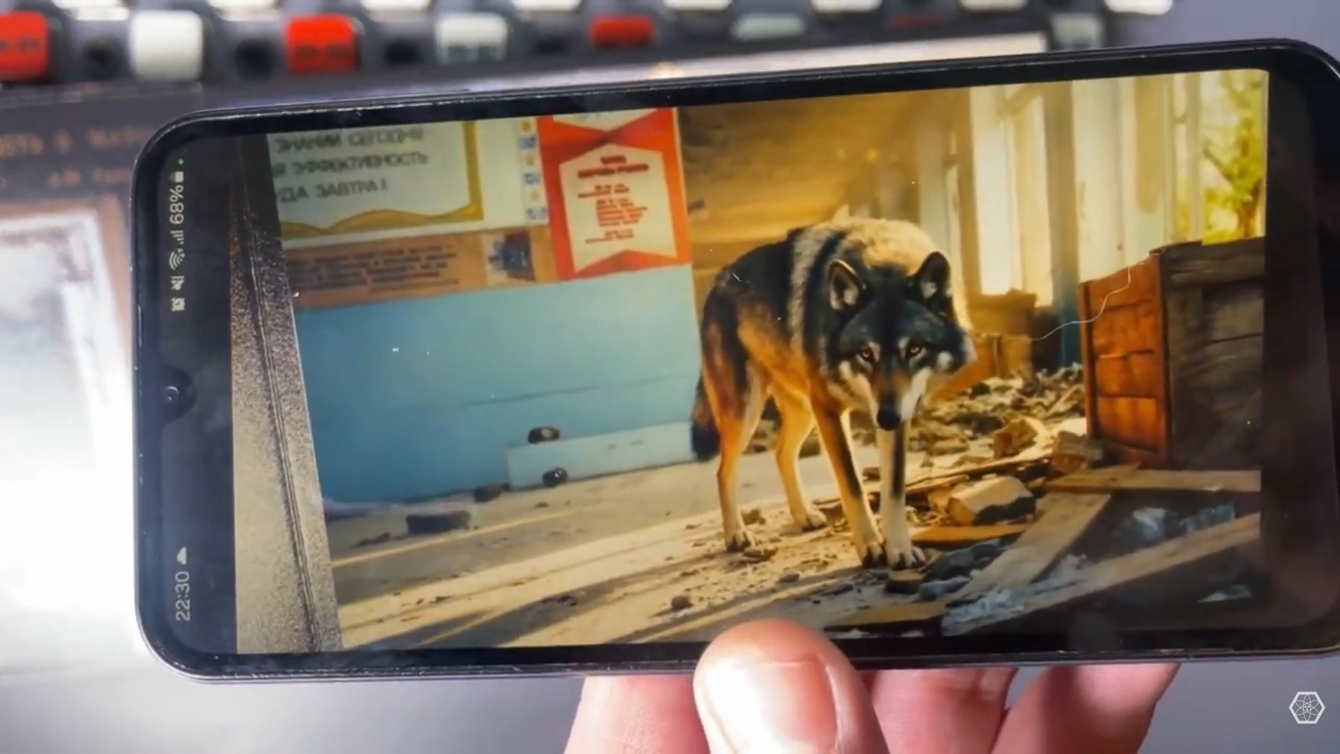 Trzon materiału stanowią zdjęcia, które przez wiele lat Ołeksandr Syrota robił w Prypeci i innych miejscach w Czarnobylskiej Strefie Wykluczenia. W druku pozostają one klasycznymi fotografiami – nietkniętymi, niezmanipulowanymi, wolnymi od inscenizacji. Jednak, gdy skierujemy na nie kamerę smarftona, fotografie ożywają. Na tle znany, często pustych krajobrazów pojawiają się mieszkańcy dzisiejszej Zony – zwierzęta, które powróciły w rejon czarnobylskiej elektrowni lub nigdy z niego nie odeszły.
