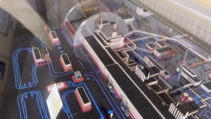 W holu centrum biurowego elektrowni można zobaczyć modele nowego sarkofagu, bloków energetycznych, magazynów paliwa jądrowego i zakładów przetwarzania odpadów promieniotwórczych.
