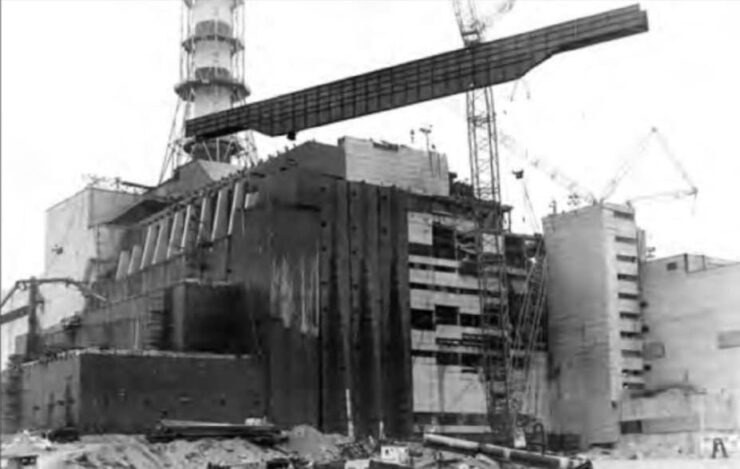 Koniec października 1986 r. to końcowa faza budowy sarkofagu. Od strony północnej zamontowano już ścianę kaskadową. Reaktor przykryto rurowym dachm, a hala turbin została pokryta osłonami i oddzielona od bloku trzeciego ścianą działową. Rozpoczęto montaż zachodniej ściany przyporowej. Jednak po południowej stronie budynku reaktora nad całkowicie zniszczonym instalacją odgazowywacza widniała ogromna dziura.