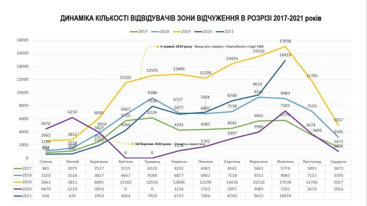 Październik był rekordowy pod względem liczby osób, które odwiedziły Czarnobylską Strefę Wykluczenia. Jak donosi Organizacyjno-Techniczne i Informacyjne Centrum Zarządzania Strefą Wykluczenia, do Zony przyjechało wtedy 14919 osób. Całkowita liczba turystów od początku roku to 62422 osoby.