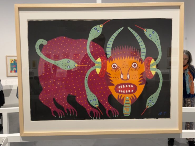 „Wojna atomowa – niech będzie przeklęta! Żeby ludzie jej nie znali, łez nie wylewali!” – pisała w rozbudowanych i poetyckich tytułach swoich prac Marija Prymaczenko. Po katastrofie czarnobylskiej z 1986 r. artystka stworzyła cykl prac, którego fragmenty można oglądać na warszawskiej wystawie. Jej postatomowe bestiarium to niebezpieczne potwory, złowrogie hybrydy, z których ust czy uszu wychodzą węże. To także przestroga przed niewidzialnym zagrożeniem, jakim było promieniotwórcze skażenie i niszcząca naturalny porządek świata kultura sowiecka.