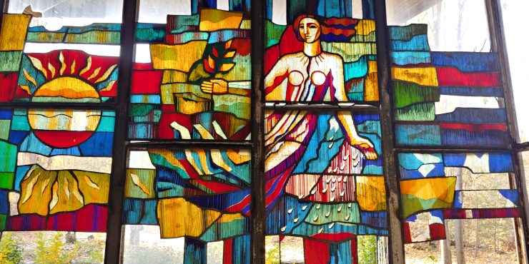 Witraż przedstawia kobiety, kwiaty, Słońce i planety. Jego autorem jest Wiktor Aleksandrowicz Blinow – urodzony w 1946 r. na Wyspach Sołowieckich artysta, który ukończył Państwowy Lwowski Instytut Sztuki Stosowanej i Dekoracyjnej. Znany był z prac rzeźbiarskich, sztuki monumentalnej i dekoracyjnej. Obecnie mieszka w Macedonii. Same szklane ozdoby powstały w jednym z zakładów witraży w Kijowie.