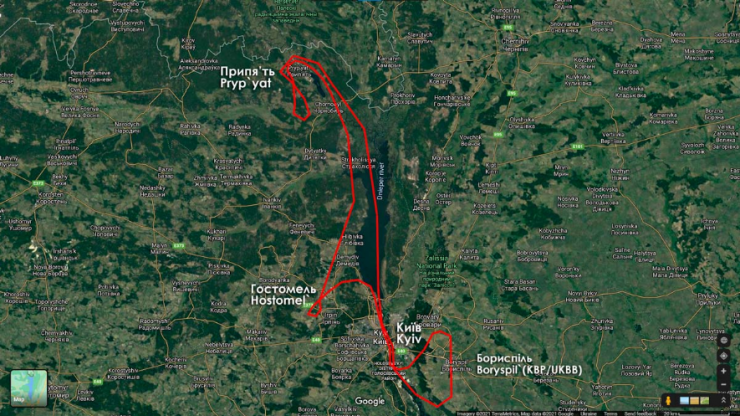 - godz. 12.00-12.05 – przelot nad Kijowem wzdłuż rzeki Dniepr